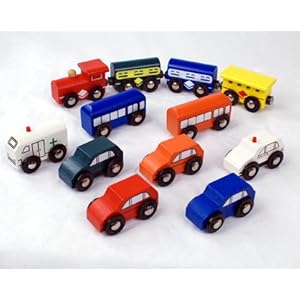 This set of wooden vehicles offers great value for the money. For less than the cost of a single Thomas engine, here you get four cars, two buses, two emergency vehicles and a little red engine pulling three cars. They are very simple but have a few cute details and they can take a lot of abuse. We have several Thomas and Imaginarium trains and vehicles, but sometimes my two little boys just like to play with these ones and I am happy that there are more or less two of each (except the engine), so we don't have too many problems sharing. Given how expensive wooden toys normally are, this is a great choice!